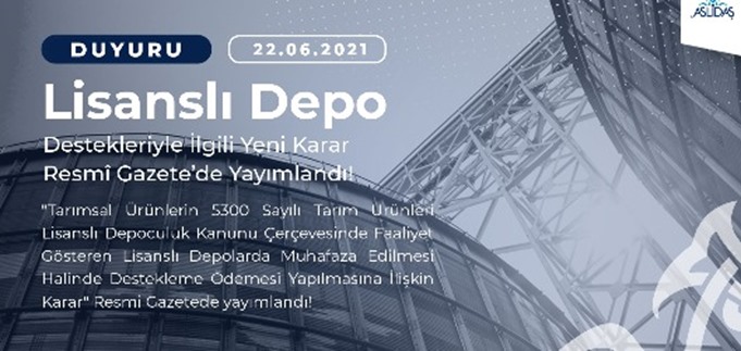 Tarımsal Ürünlerin 5300 Sayılı Lisanslı Depoculuk Kanunu Çerçevesinde Faaliyet Gösteren Lisanslı Depolarda Muhafaza Edilmesi Halinde Destekleme Ödemesi Yapılmasına İlişkin Karar 22.06.2021 tarihinde resmi gazetede yayımlanmıştır.